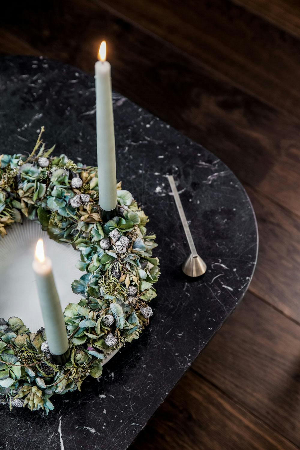 Adventskransen ligger på et fat fra Kähler, lyseslukkeren kommer fra Ferm Living.