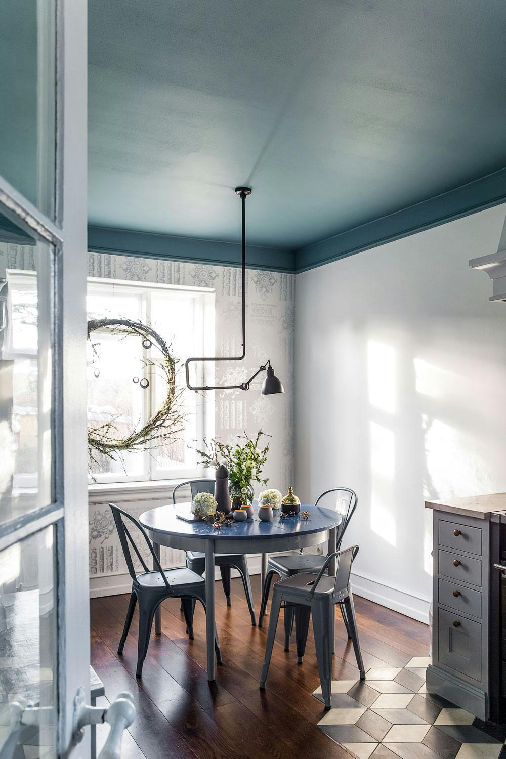 Bordet er et arvestykke mens lampen er fra La Lampe Gras og stolene fra Tolix. Vasen og krukken på bordet er fra Design by Us og telysholderne fra Ditte Fischer.
