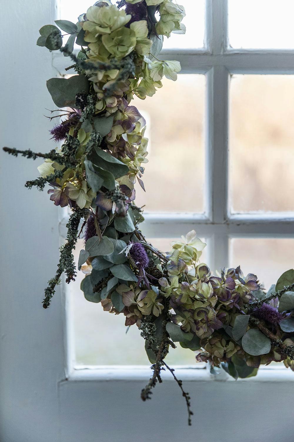 De fleste av oss henger en krans på inngangsdøren som velkomsthilsen for julegjestene, men hvorfor ikke henge opp en på innsiden av døren også, og ha glede av den hver gang du går forbi? Bind f.eks. en krans av tørket hortensia, eukalyptus, kvister og tistler som fremhever fargen i hortensiaen. Start med å lage en sirkel av kraftig ståltråd, og fest grener og blomster til denne med tynn ståltråd eller grønn blomstertråd som er mindre synlig. Fordel blomster og blader slik at kransen blir symmetrisk.