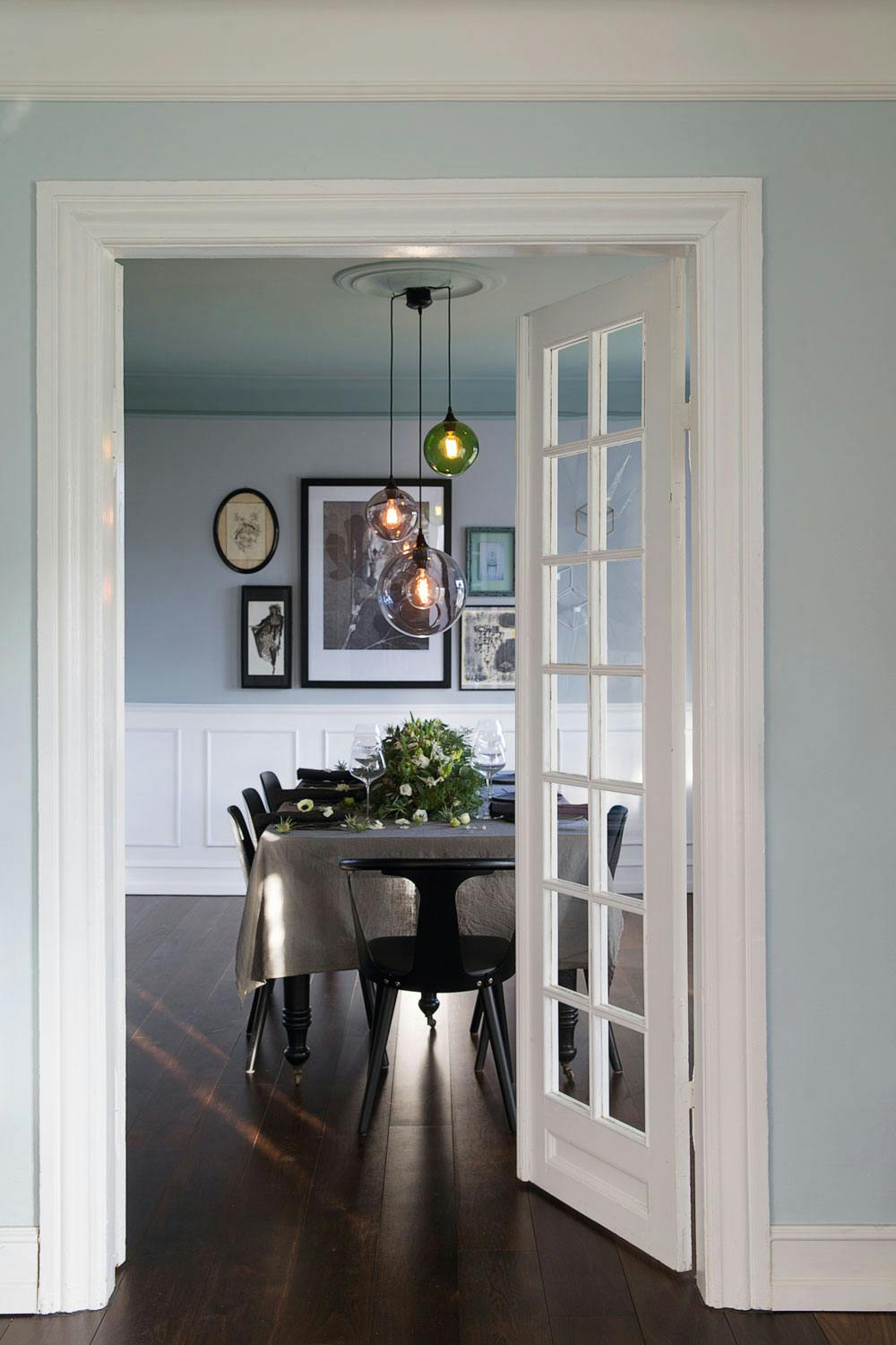 Bordet er dekket med duk og servietter fra Himla og glass fra Spiegelau. Stoler fra &Tradition og glasspendler fra Design by Us.