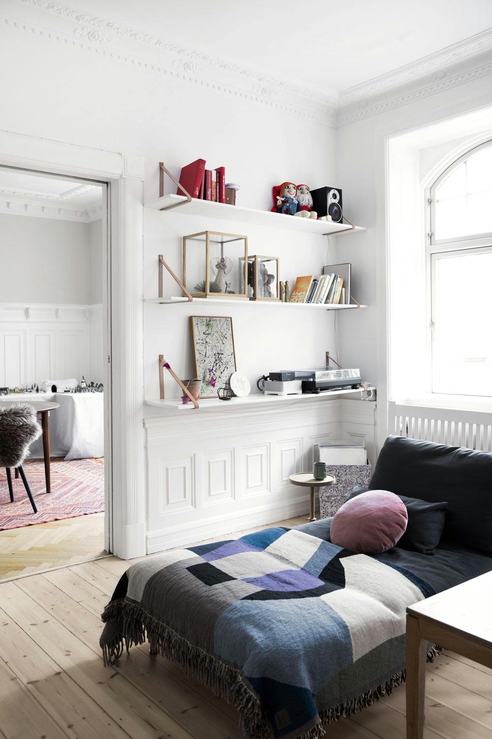 I stuen står en romslig daybed fra Ikea som virkelig innbyr til kos eller en liten middagshvil. Hyllene med oppheng av lærreimer, er Tony og Mettes eget prosjekt.