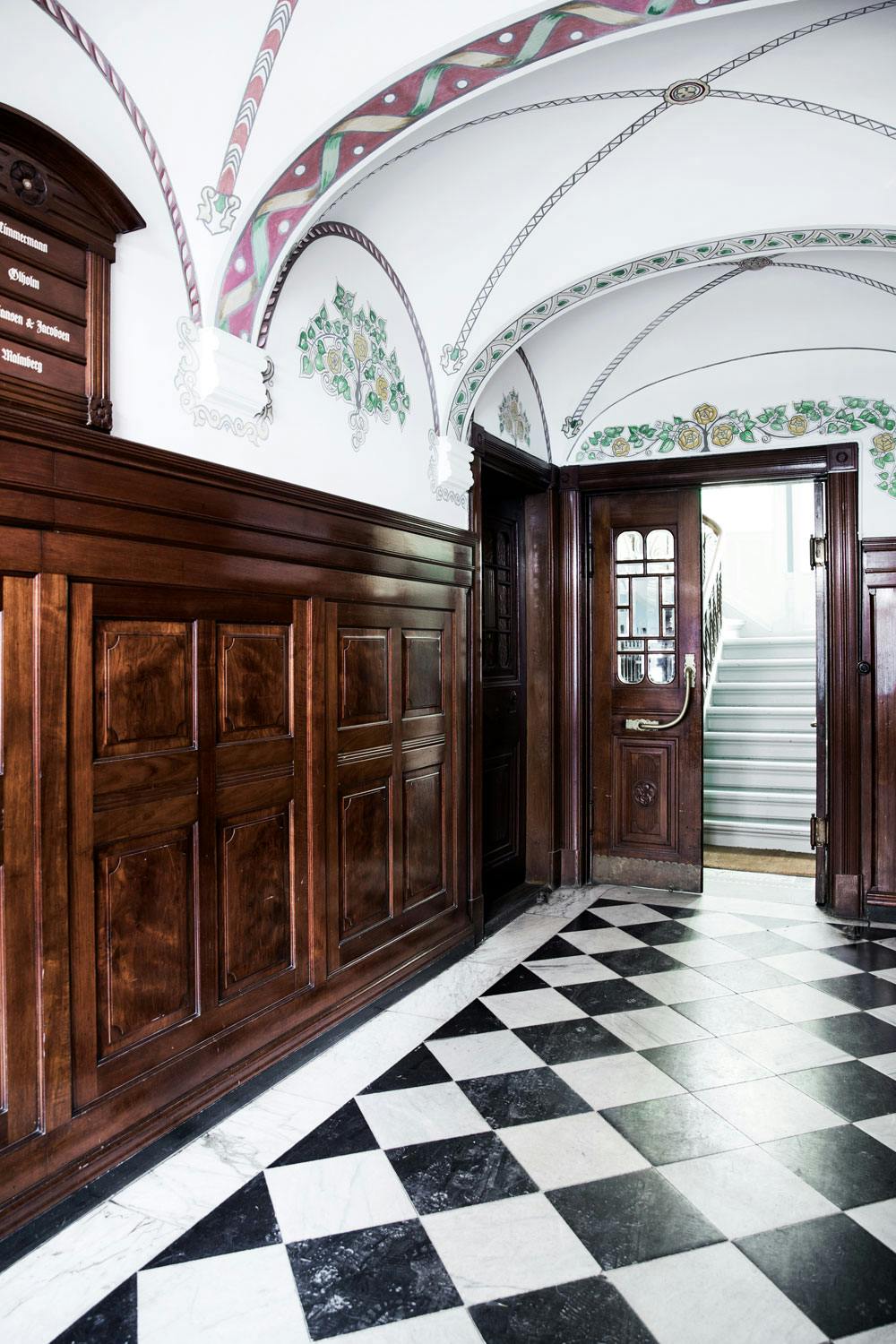 Mette og Tony har prøvd å videreføre uttrykket i den vakre oppgangen inne i leiligheten.