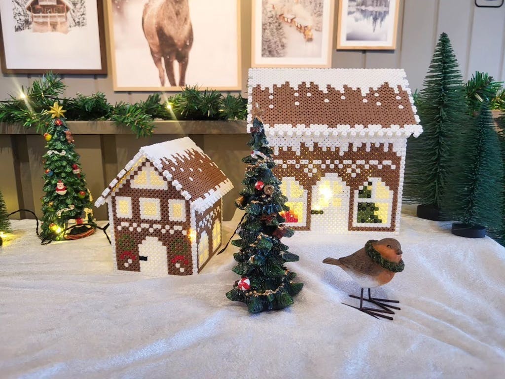 Med fargerike perler kan dere bygge små, sjarmerende hus og julepyntede gater.