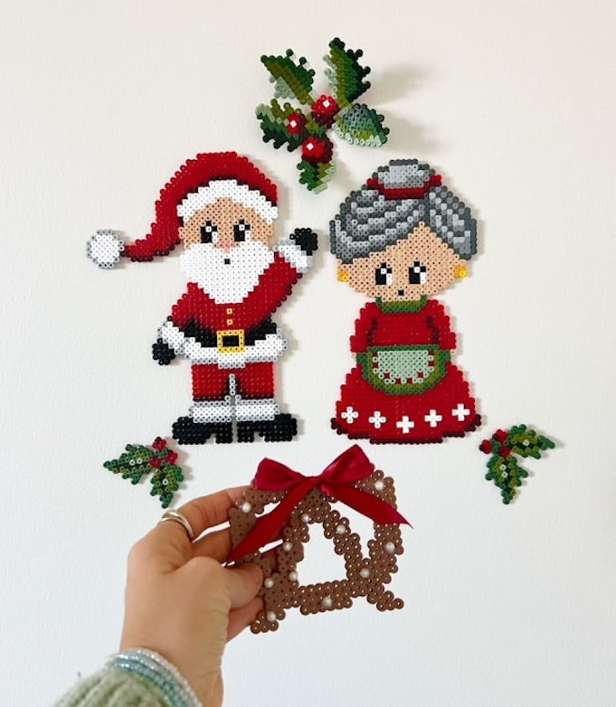 Legg et personlig preg på juledekorasjonen din med en fargerik julenisse og hans kone laget av perleplater.