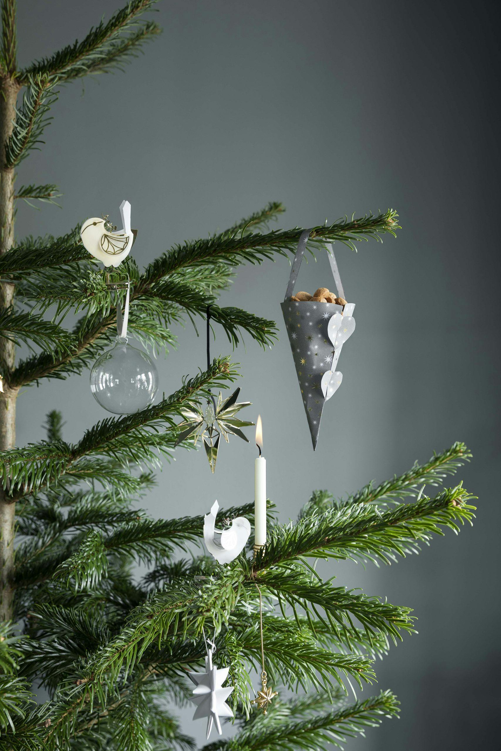 - Drømmer du om et enkelt, men vakkert tre som passer godt til en nordisk innredning, kan du holde deg til pynt i kjølige nyanser som hvitt og grått, eventuelt mikset med diskrete jordfarger.