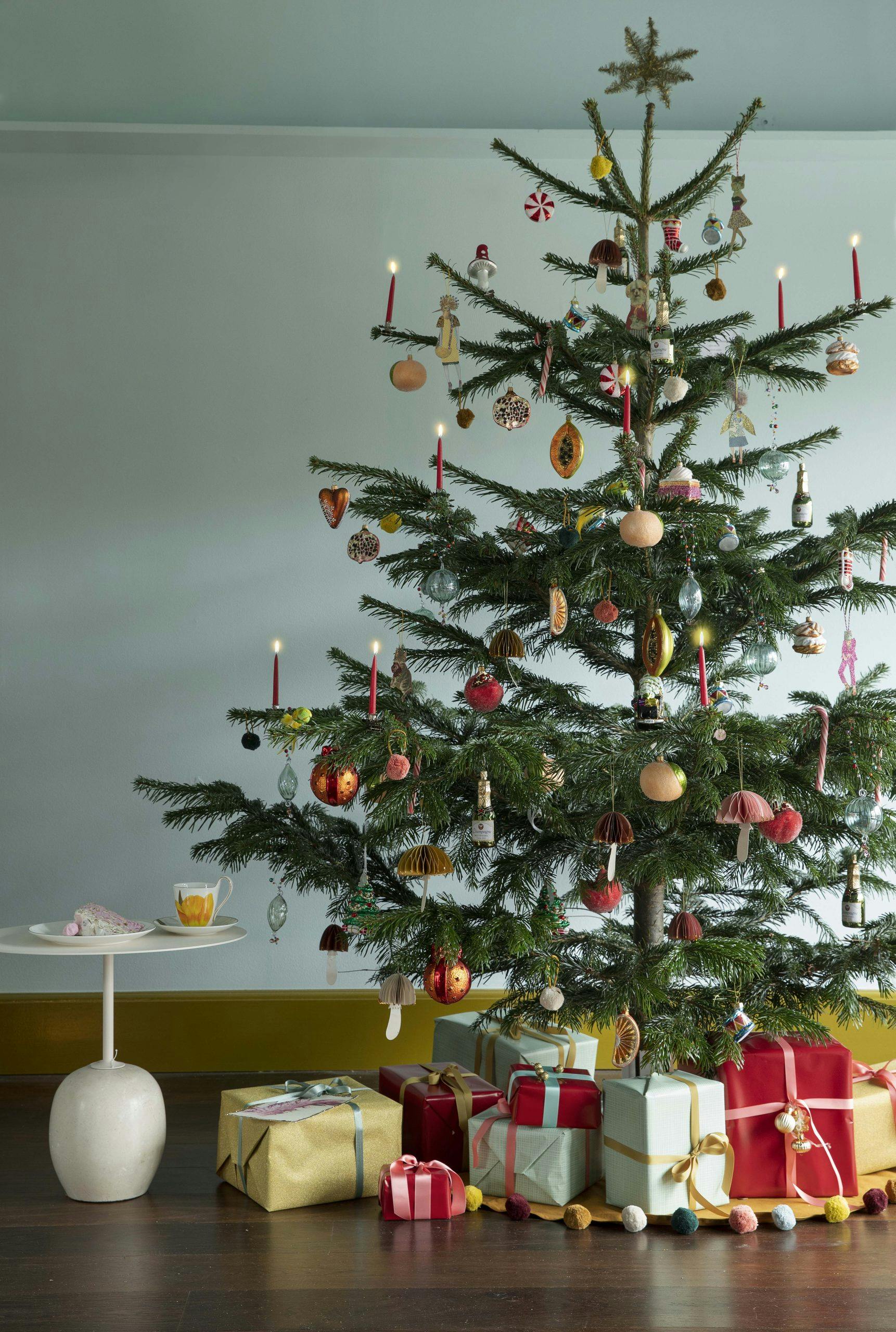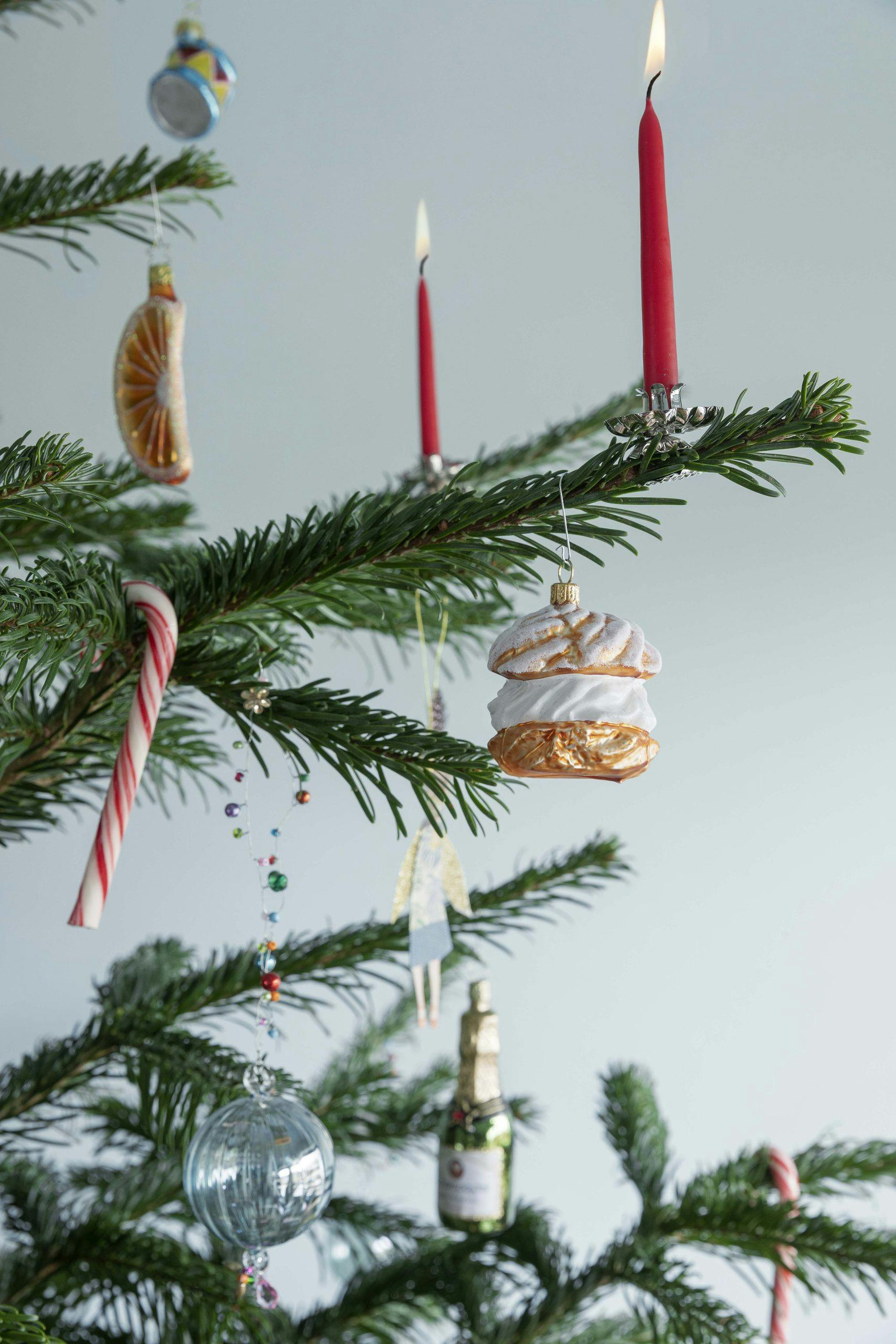 - Vil du ha et juletre som er humoristisk og litt utradisjonelt? Lek i vei og bland klassiske julemotiver som sukkertøystokker, julekuler og tørkede appelsinskiver med morsomme champagneflasker, dyrefigurer, kaker og meloner.