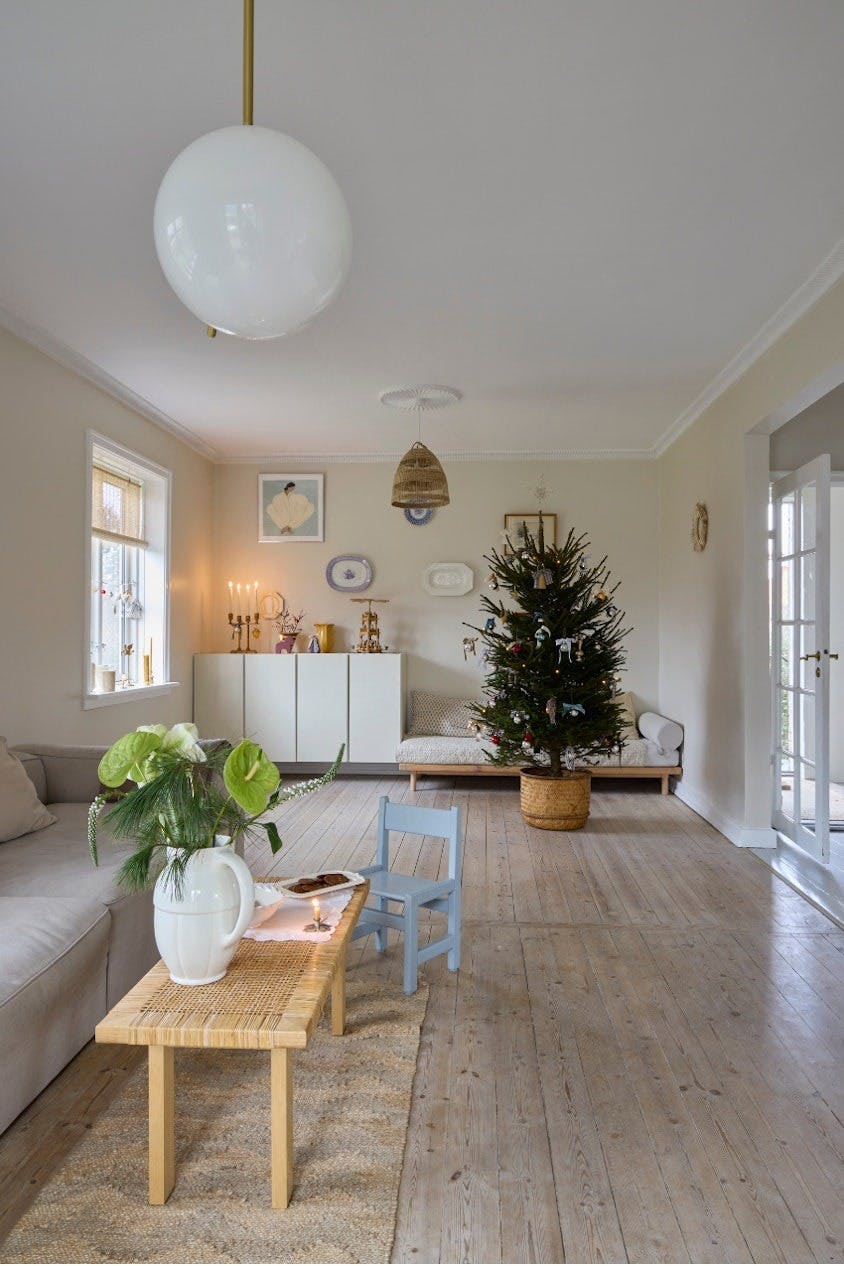 Juletreet lyser opp og skaper masse kos i den lyse stuen. Fatene og plattene på veggen er funnet på loppemarkeder og i bruktbutikker. Daybedden fra Ikea, mens det store englespillet på skapet er vintage.