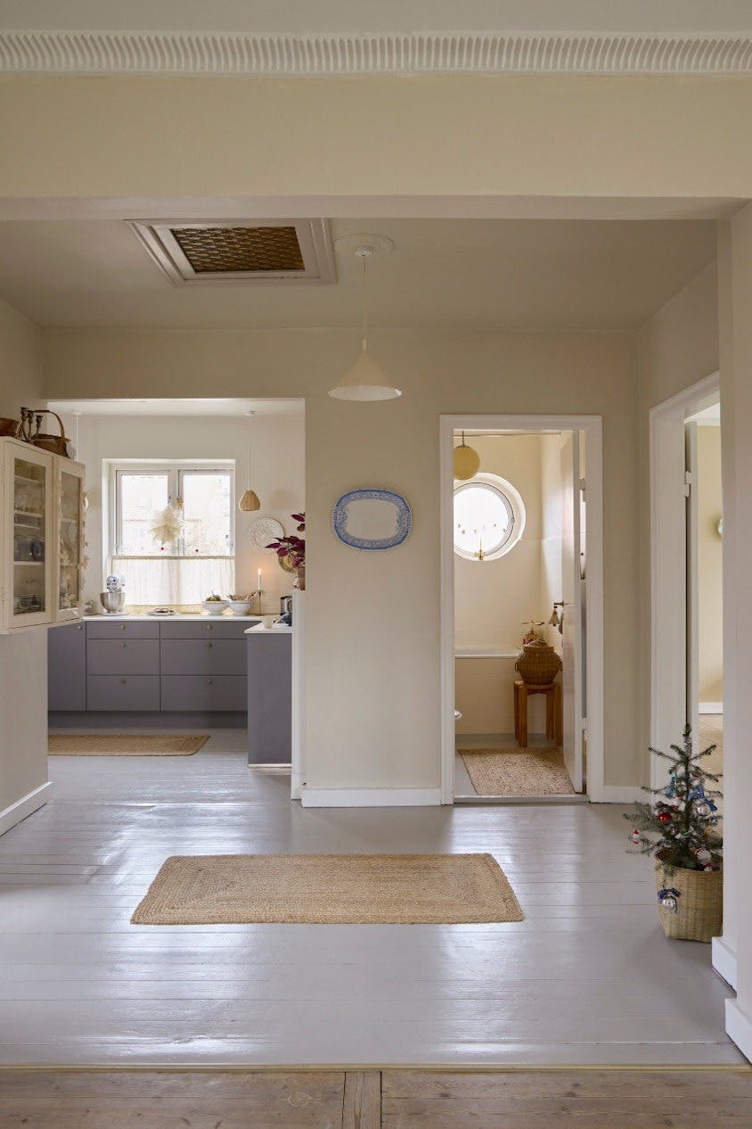Gulvteppet i gangen er fra Jysk, mens fatet på veggen er vintage.