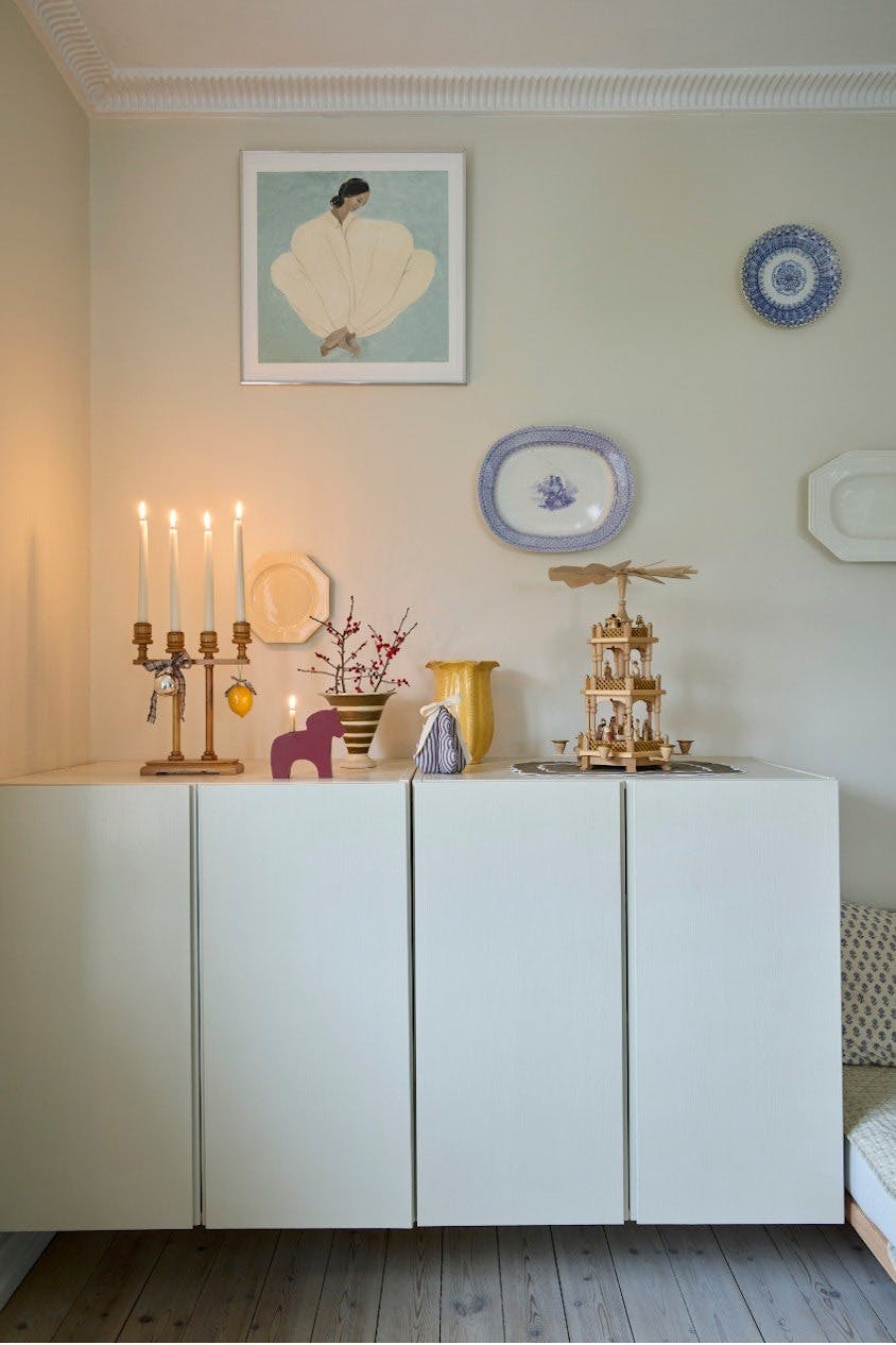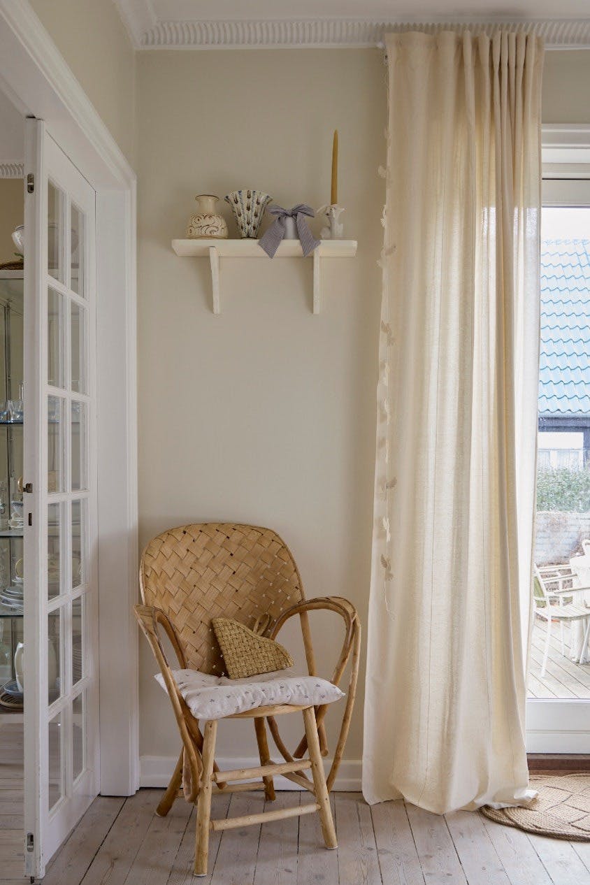 På hyllen står bl.a. en Kähler-vase og en juleklokke med en sløyfe som Pernilles søster har lagd. Rottingstolen er fra Le Corbusier.