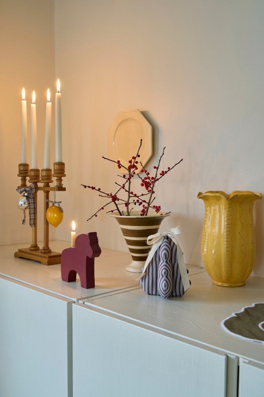En av Pernilles julefavoritter er den lille, svenske hesten som også er en lysestake. Den er et loppefunn som har fulgt henne i mange år. Den store lysestaken er vintage, det samme er den gule Kähler-vasen. Pernilles søster har lagd juletreet i stoff.