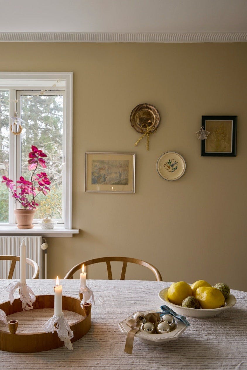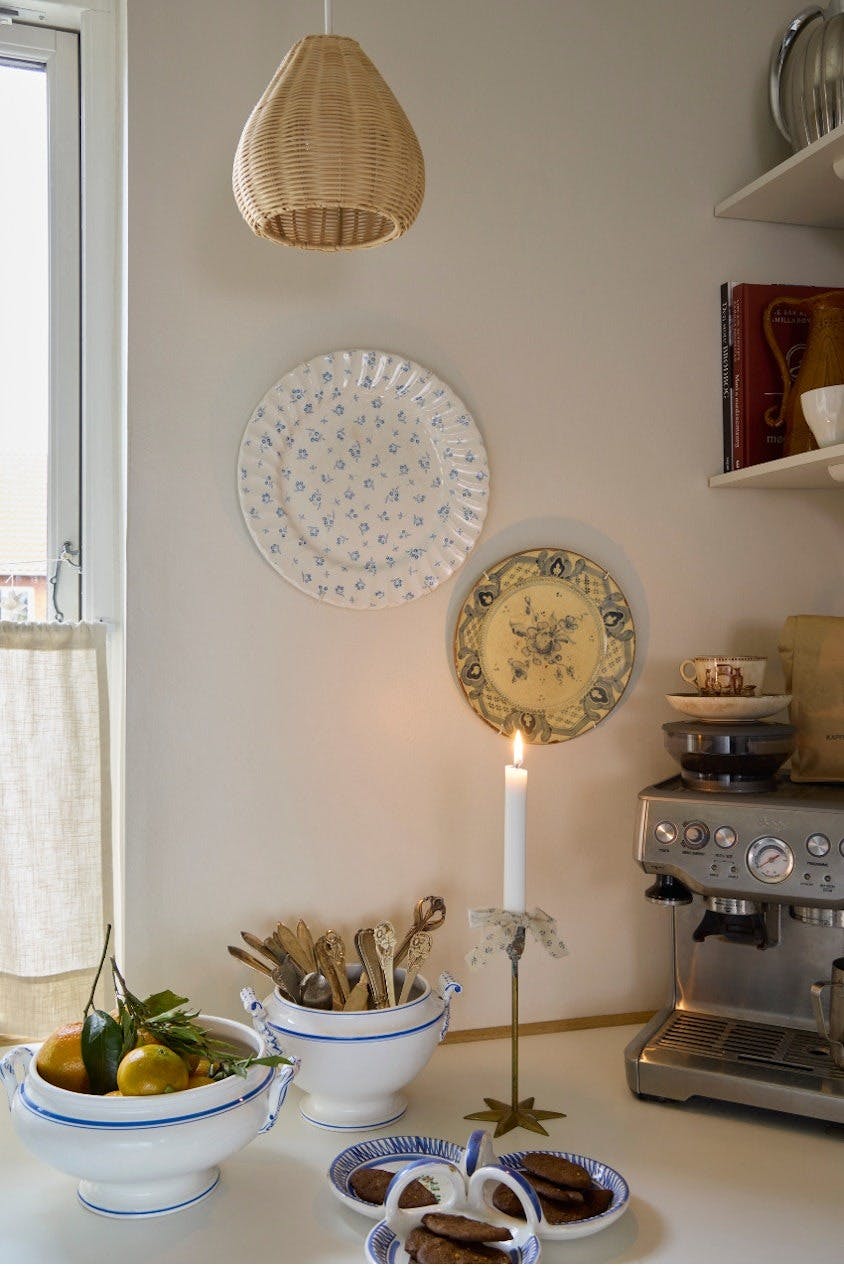 Et levende lys og litt utvalgt pynt er alt som skal til for å skape julestemning på kjøkkenet. Fatet på veggen er et vintagefunn.