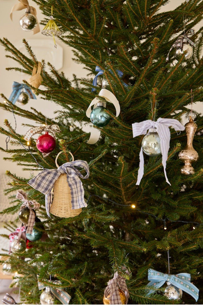- Understrek stemningen med et stort juletre, men pynt det med vintagefunn i dempede farger som glir fint inn i innredningen din.