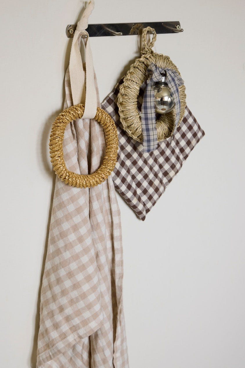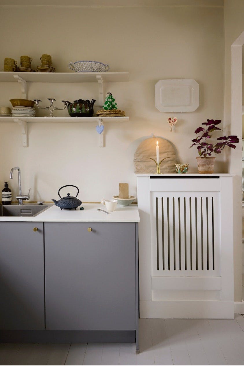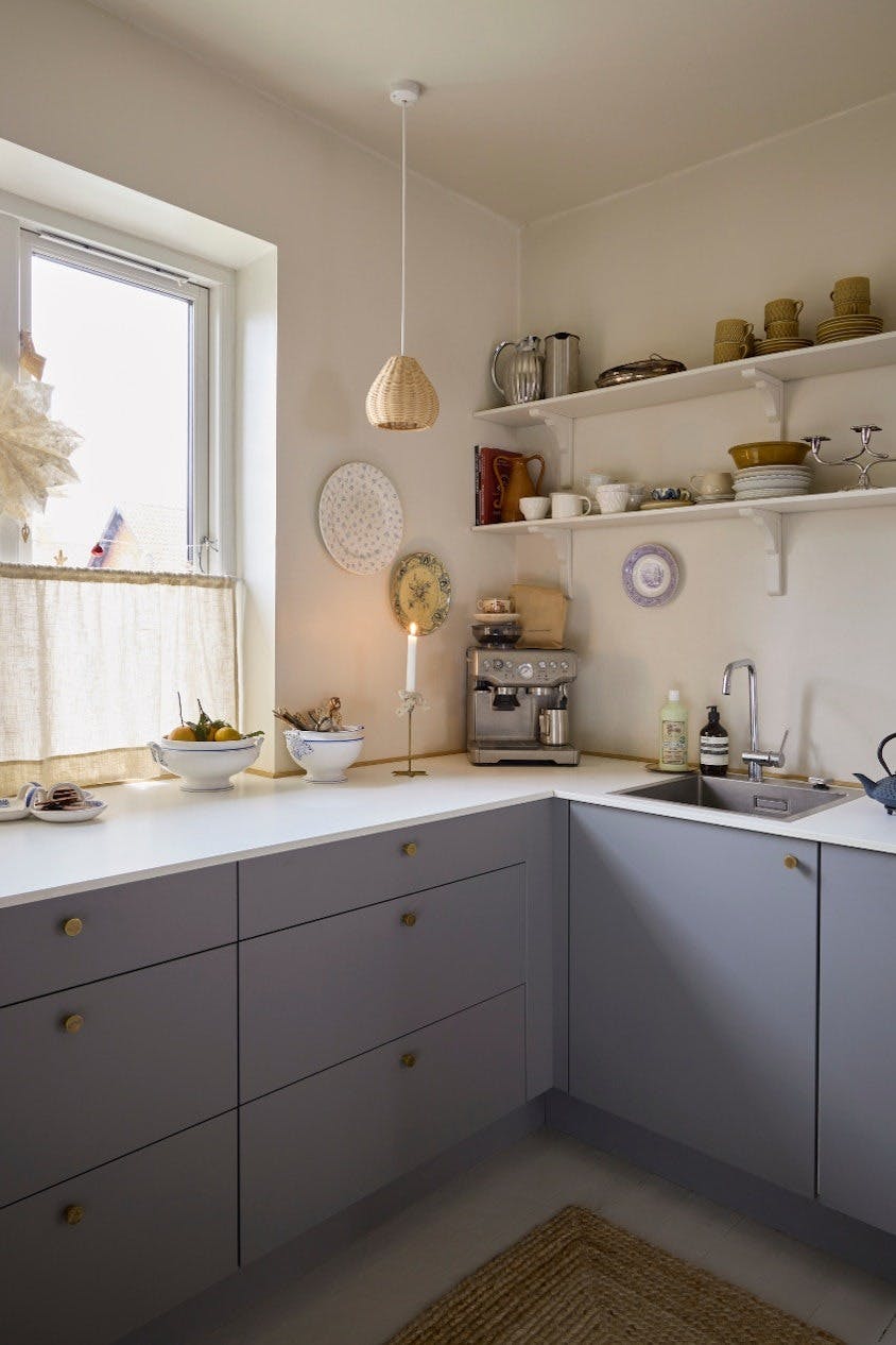 Kjøkkeninnredningen er fra Vordingborg Køkkenet og den flettede pendelen fra Søstrene Grene. De åpne vegghyllene gir både ekstra oppbevaringsplass og utsikt til Pernilles mange sjarmerende loppefunn.