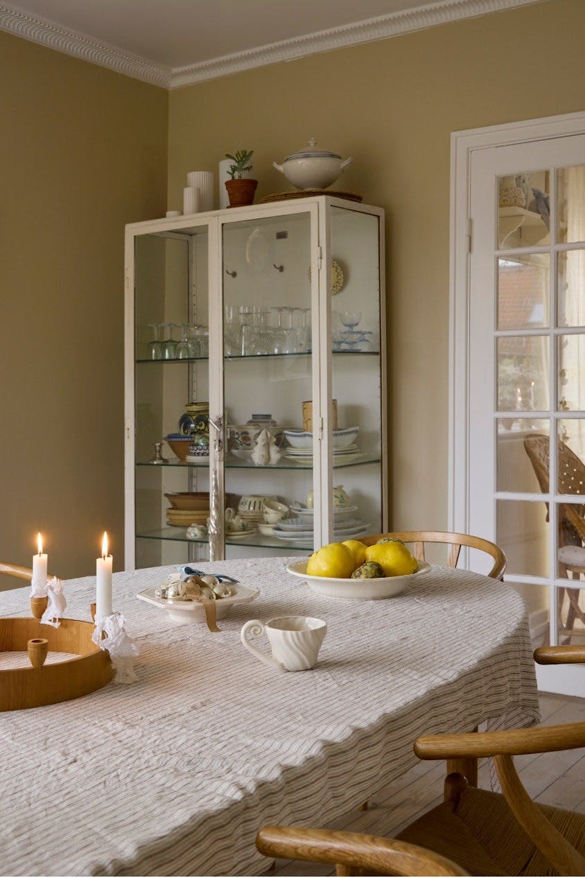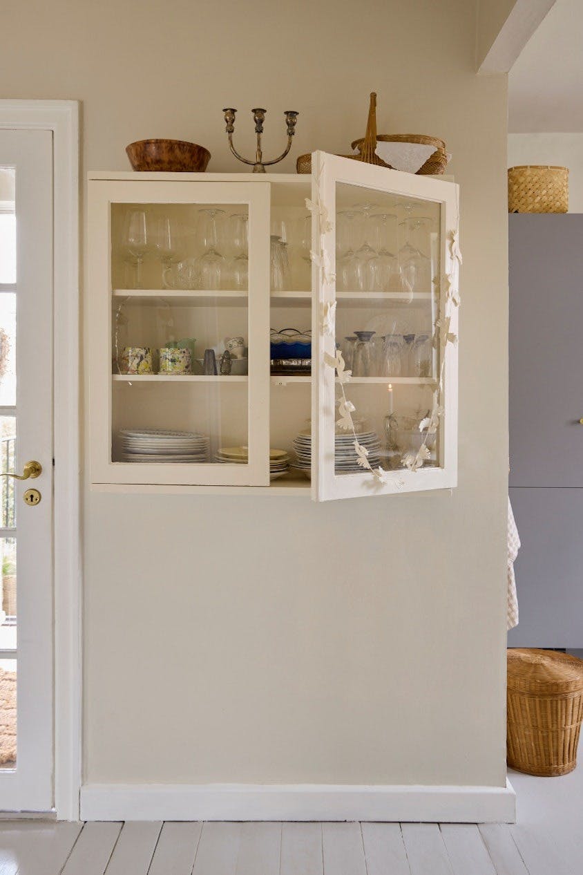 Det flotte vitrineskapet var opprinnelig et medisinskap, men hjemme hos Pernille er det fylt med vakre glass og fin keramikk. Kaffekoppen på bordet er fra Atelier Mareé.