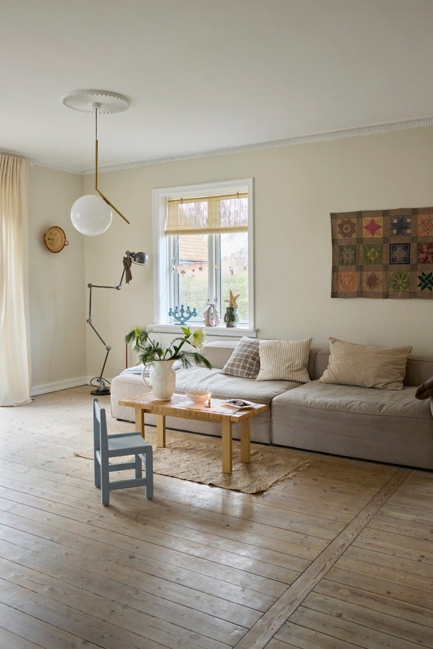 Pendelen er fra Flos, gulvlampen fra Jieldé og veggquilten et loppefunn, mens sofaen er fra Decotique, sofabordet fra Ikea og barnestolen er kjøpt på loppis.