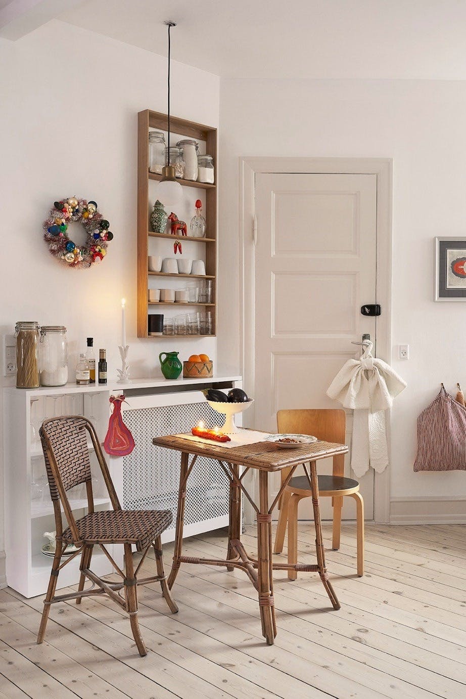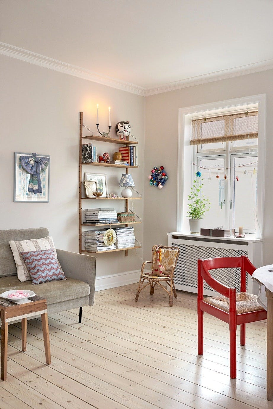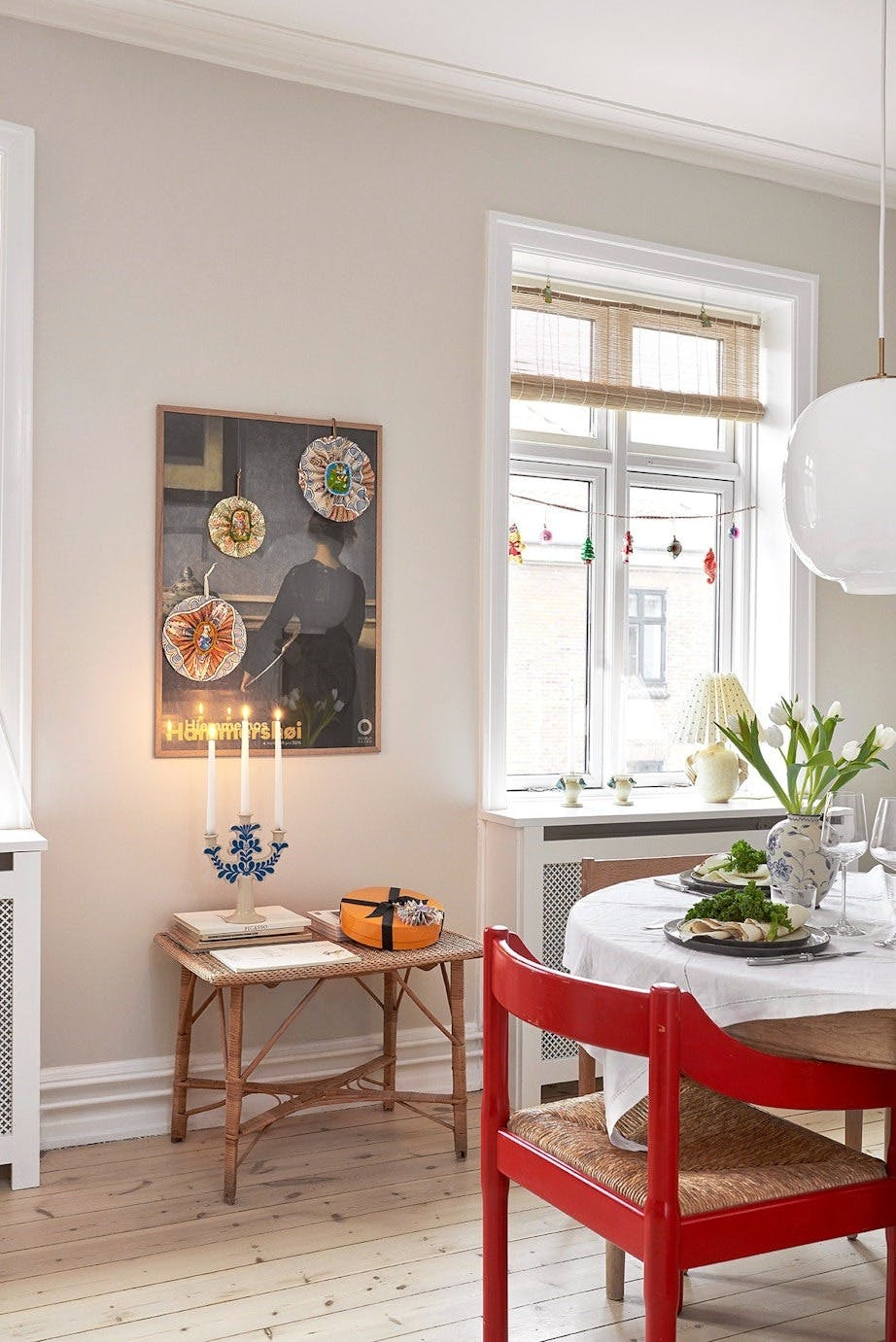 Det lille rottingbordet er et bruktfunn og lysestaken kommer fra Höganäs, mens den røde spisebordstolen er designet av Vico Magistretti.