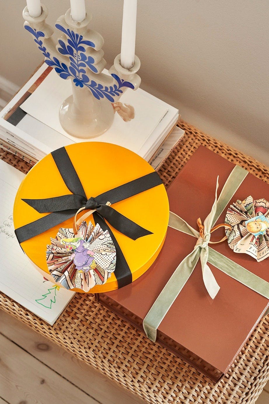 – I stedet for å bruke innpakningspapir til julegavene, kan du kjøpe fine esker og bokser til å pakke presangene inn i og gjøre eskene til en del av gaven. Pynt dem med fine stoffbånd og hjemme- lagde til og fra-kort, og la pakkene stå fremme og pynte opp til de skal legges under treet på julaften.