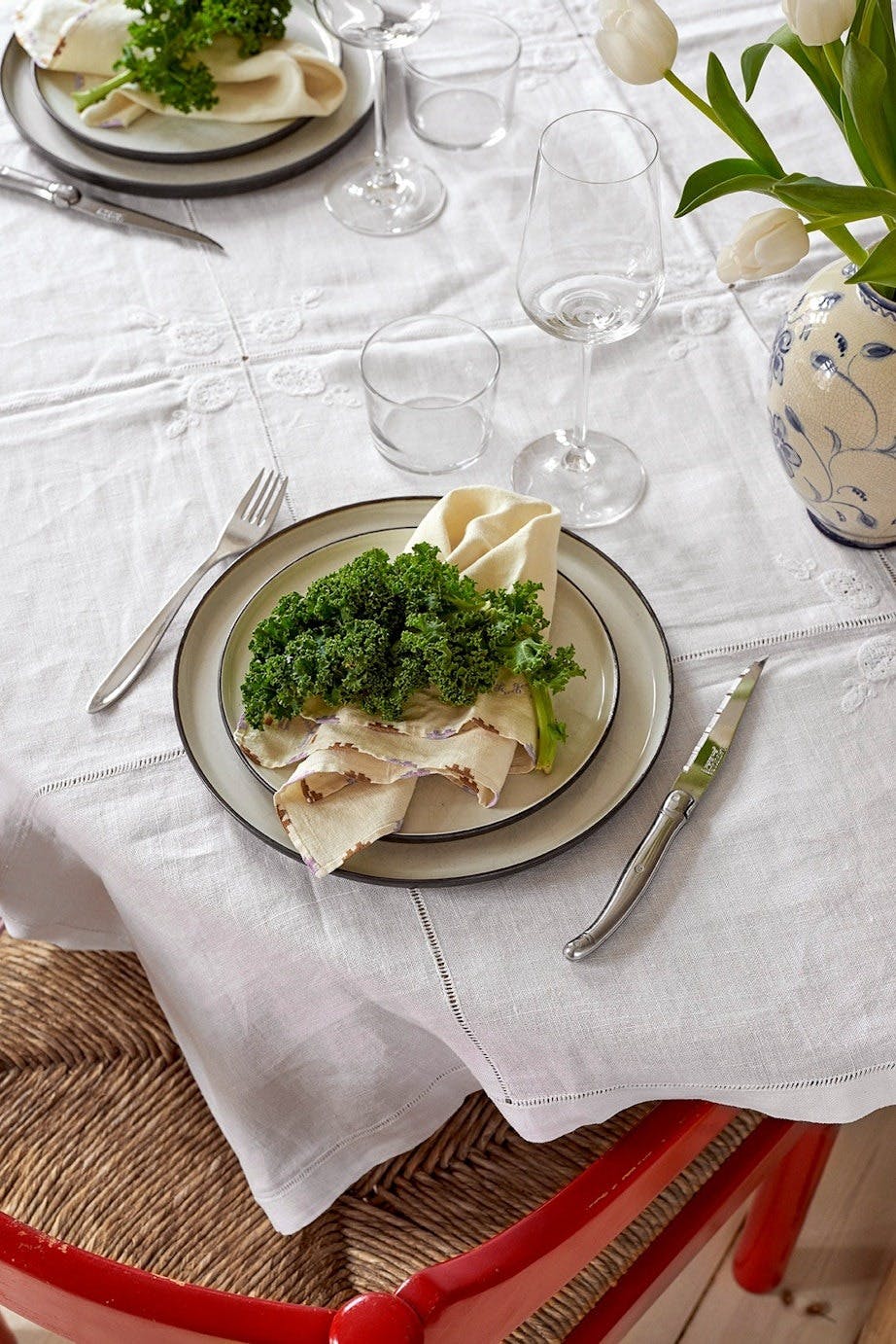 Duken er et fransk loppefunn og vinglassene er fra Spiegelau, mens tallerkenene er fra Broste Copenhagen og knivene fra Laguiole.