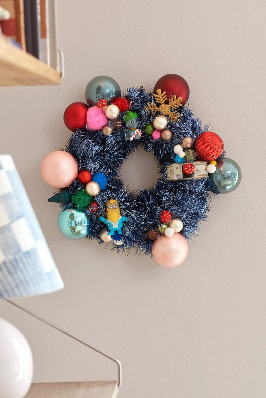 – For noen år siden begynte jeg å lage humoristiske, utradisjonelle julekranser. Glitter, lekerog kuler i alle former og farger er midt i blinken for meg. Jeg bruker isoporkranser som base og kjøper glittergirlandere og julekuler i bruktbutikker. De små lekene finner jeg på barnerommet hjemme, der er det alltid noe som ikke brukes lenger. Alt festes til kransen med limpistol. Jeg syns det er så gøy å lage slike kranser, så det blir noen nye hvert år.