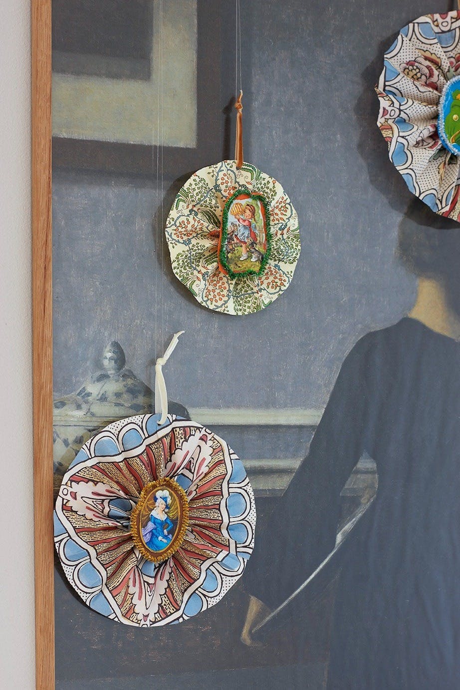 Plakaten er fra en utstilling med kunstneren Vilhelm Hammershøi, mens rosettene er lagd av gavepapir og gamle glansbilder.