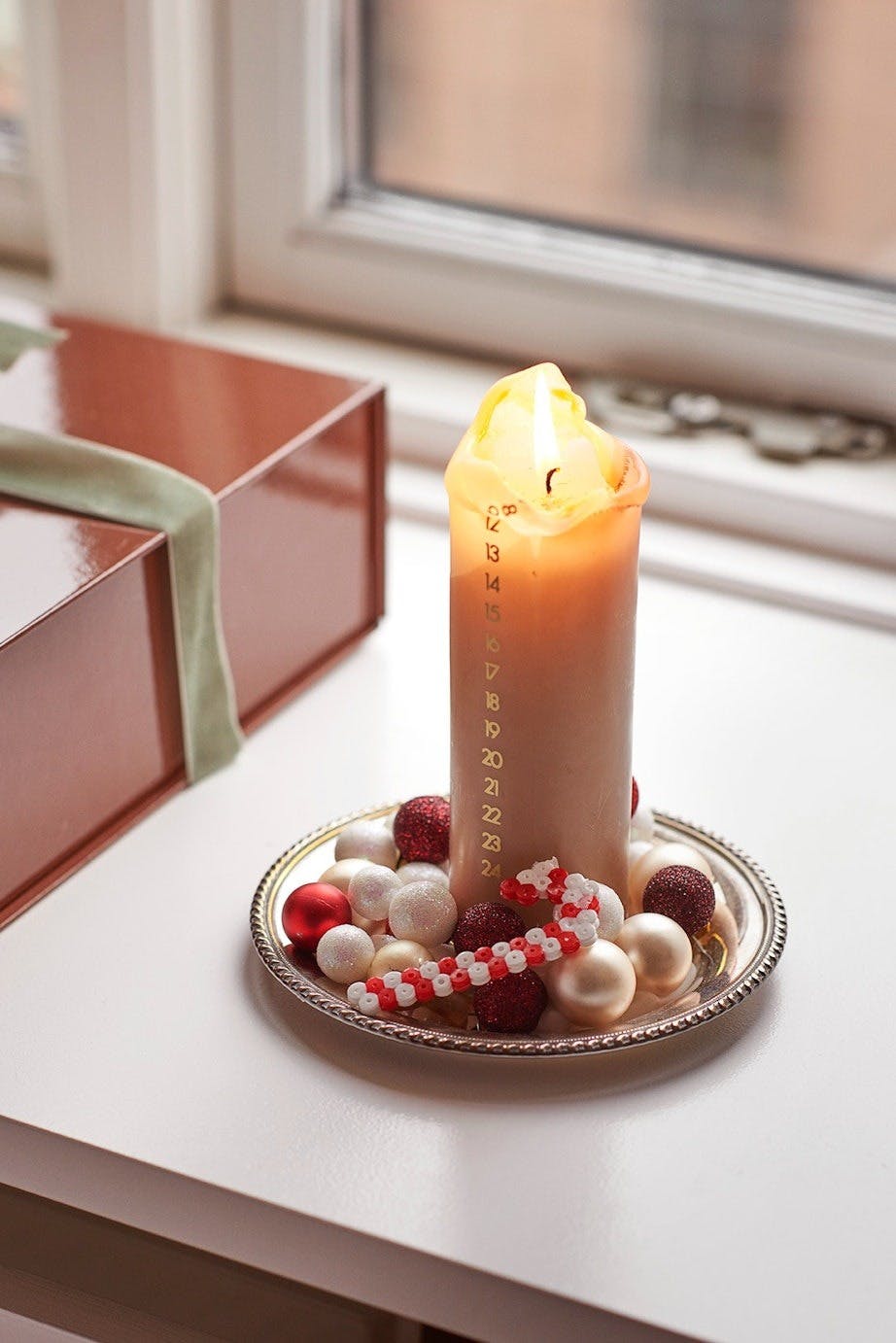 – Kalenderlys er så koselig, men det er ikke alltid man har tid til å lage en fin dekorasjon. Her er en enkel og rask løsning som gir masse stemning. Sett kalenderlyset på en fin skål eller tallerken, legg små kuler i ulike farger rundt lyset, og avslutt med en annen pynteting som bryter litt med kule- ne. Jeg har brukt en liten, perlebelagt sukkerstokk