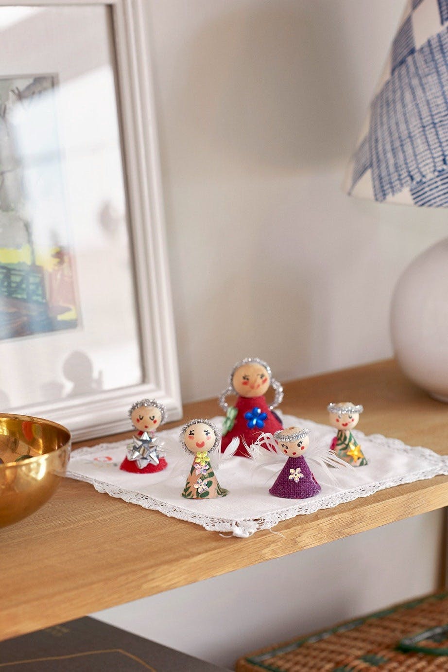 – Hent inspirasjon til hjemmelagd julepynt i butikker og på Instagram. Målet er ikke at det skal bli helt likt, men å kunne kose seg med noe annet enn å flette glanspapirhjerter og brette stjerner. På hyllen står en liten samling med engler som er DIY-utgaver av noen engler jeg en gang så i en butikk.