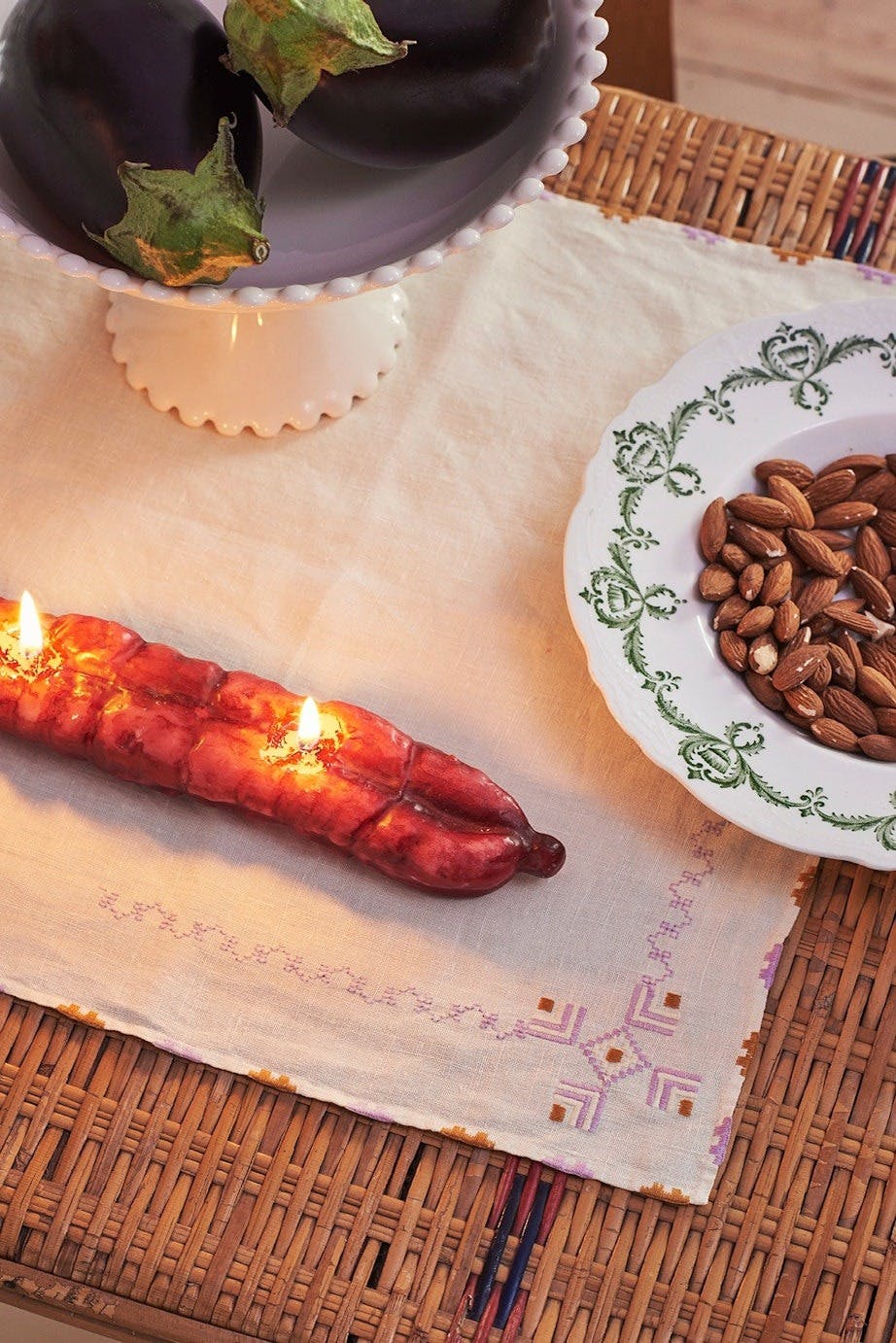Spekepølse-lyset er fra Shop-revederenard.com. Stettfatet, tallerkenen og duken er vintagefunn.