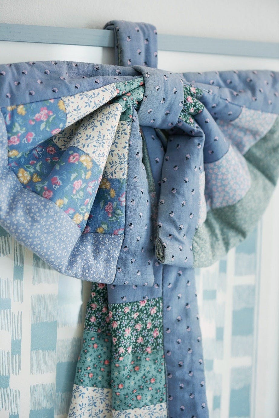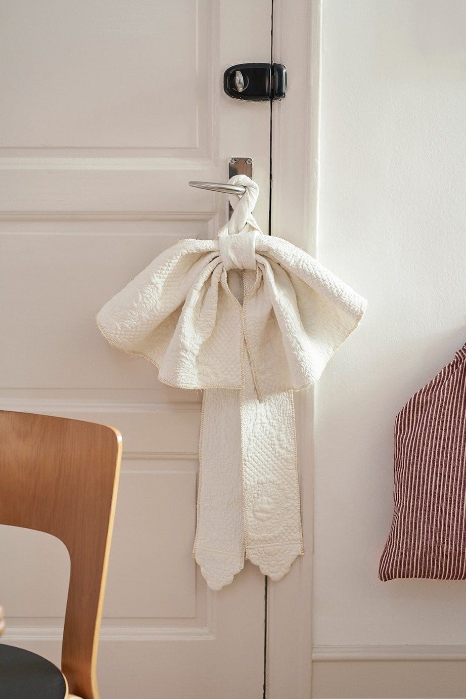 – Let i skuffer og skap – eller i bruktbutikker – etter tekstiler i vakre farger og mønstre som du kan forvandle til unike julesløyfer. Her har et gammelt sengeteppe fått nytt liv. Sløyfene kan lages i alle størrelser, men jo større de er, jo mer wow-effekt får du.