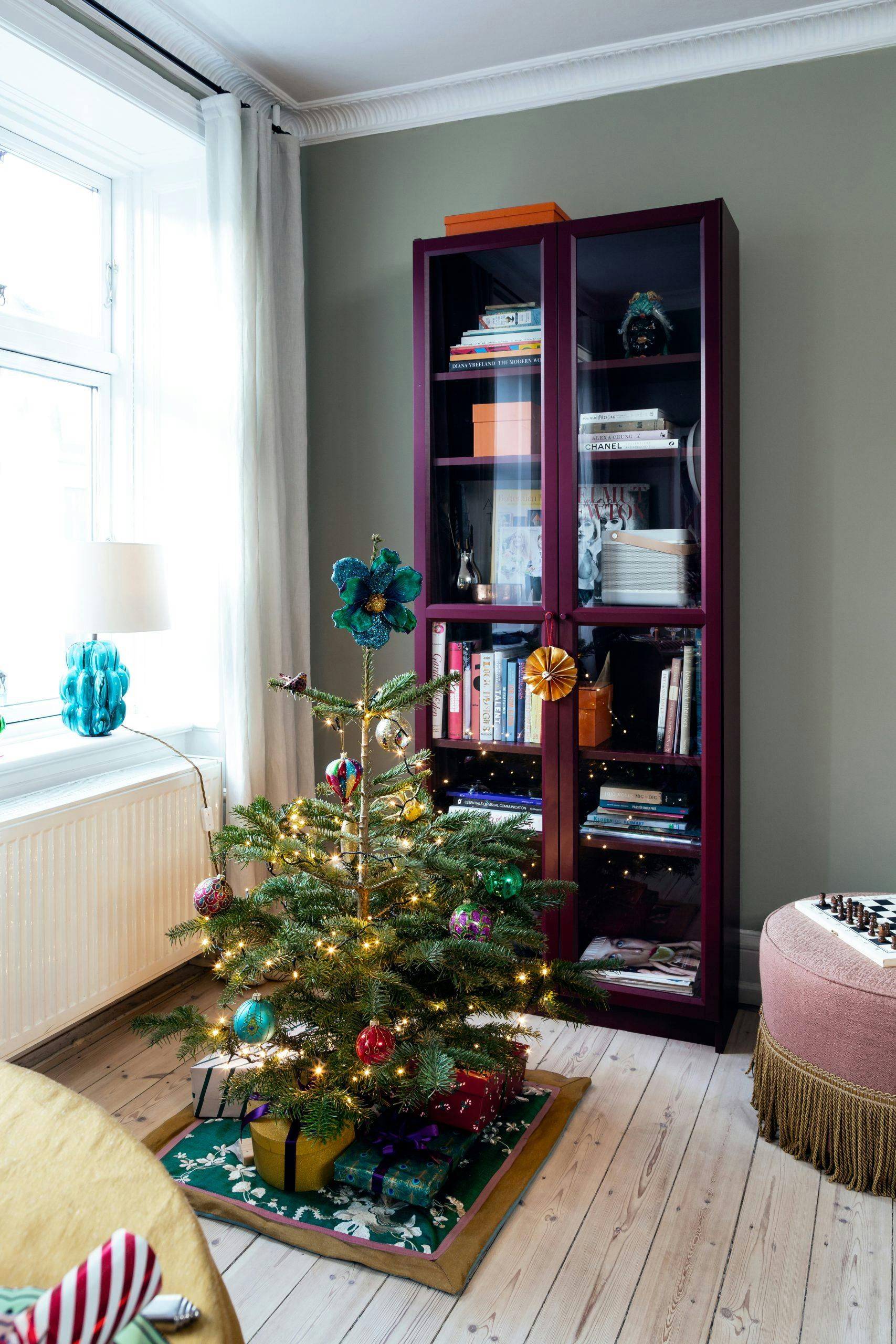 Selv om paret skal feire julaften hos Karen-Lises svigerforeldre, er et lite juletre på plass i leiligheten. Det står på et juletreteppe som Karen-Lise har sydd selv. Vitrineskapet er fra Ikea.