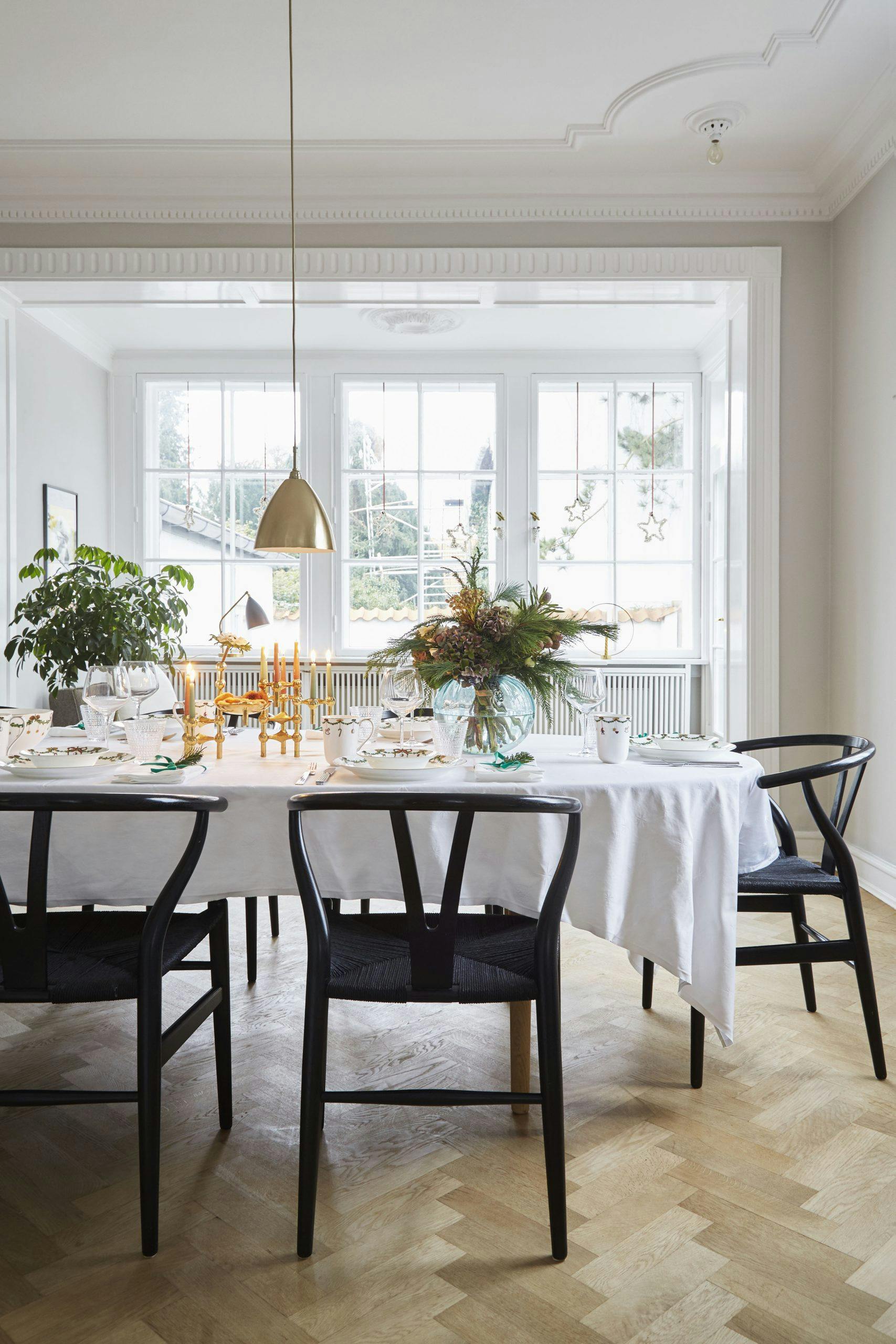 Det lange spisebordet er designet av Hans J. Wegner, mens de klassiske Y-stolene er fra Carl Hansen & Søn og pendlene fra Bestlite.