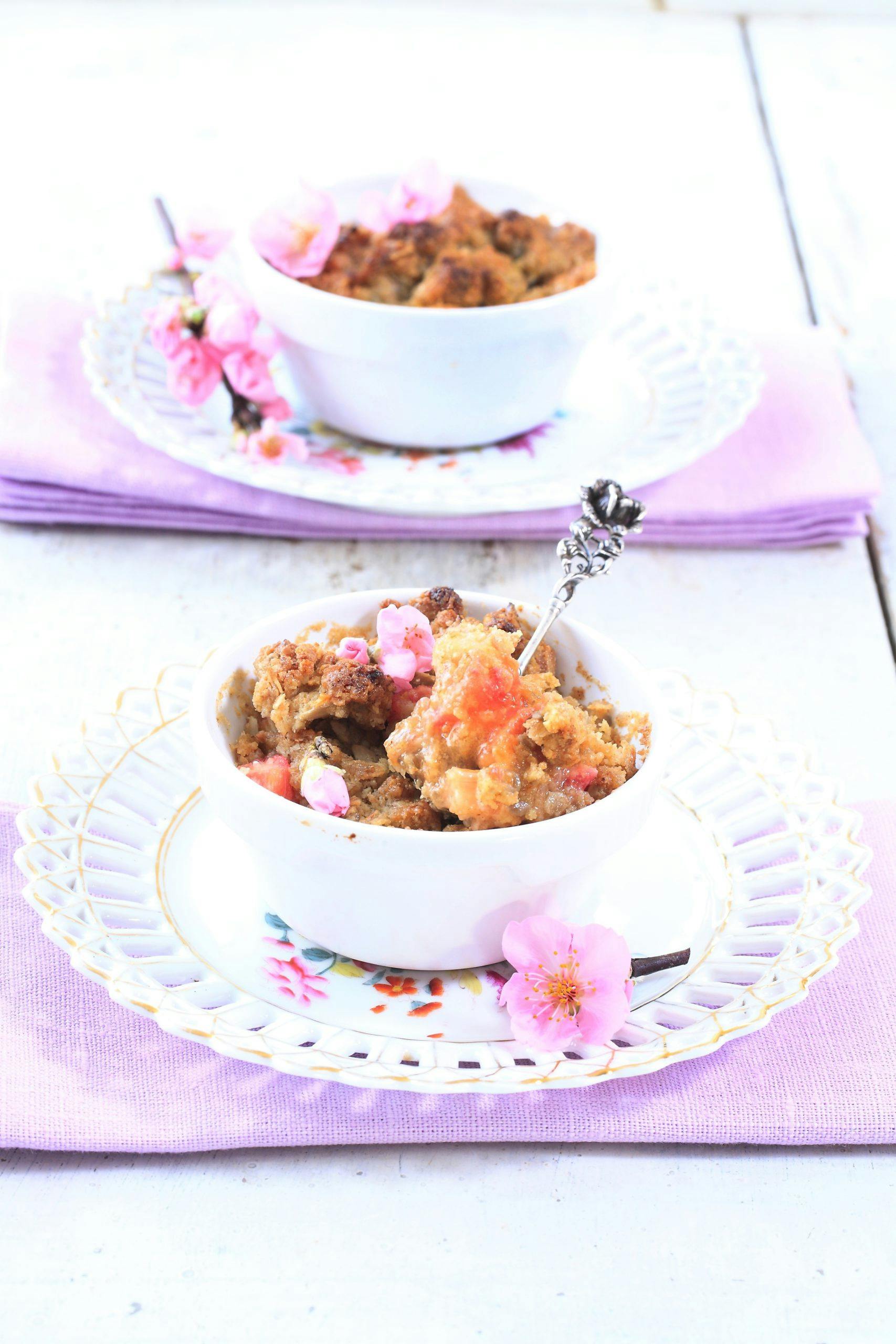 1. Sett ovnen på 225°. Bland sammen ingrediensene til smulekaken, gjerne med fingrene. Fordel halvparten i porsjonsformer.